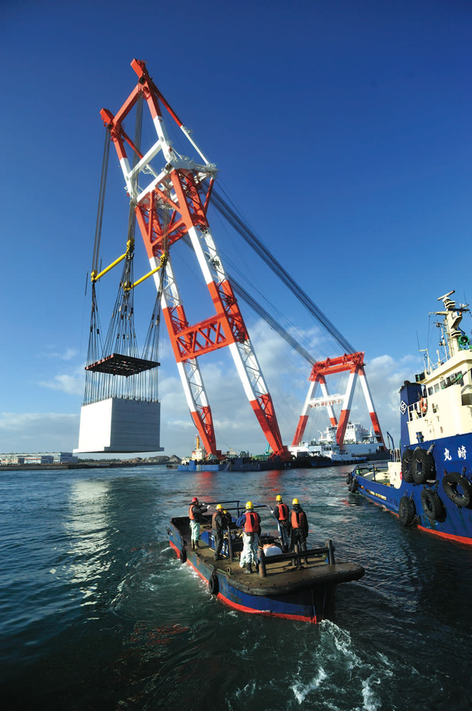 大規模な港湾の工事が、シンプルにダイナミックに描かれています。広い範囲にまたがる和歌山下津港のどこかで行われていた工事。扱う部材が大きく重過ぎるので人手介入の余地なし、といった工事の様子が描かれています。主被写体となるのは、赤と白の塗色が快晴の青空に映えて美しい巨大なクレーン。重そうなケーソンを吊り下げて傾いだように見える姿形に臨場感が。作業を見守る人々も、広い海のスペースを埋める添景として効果的です。