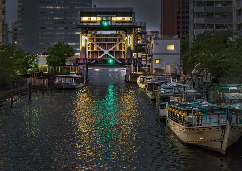 前回、東雲水門の作品が優秀賞でしたが、今回はより上位に入賞です。勝鬨橋の近く、月島川と隅田川を隔てる月島川水門。隅田川テラスを通れば間近に見られますが、受賞作は西仲橋側からの撮影。都会の運河の風景を過不足なく切り取っていますが、デジタルカメラならではの独特な描写モードが生かされています。夜間ではなく明かりが灯る頃を選び、イラスト風のエッジの利いた描写とすることで、その光、薄暮の情景が見事に表現されました。